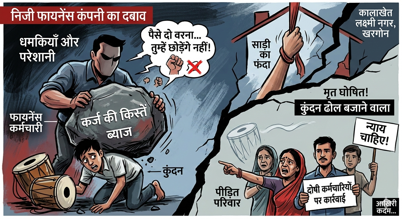 खरगोन |(संभाग पोस्ट) कोतवाली क्षेत्र के कालाखेत लक्ष्मी नगर में शुक्रवार सुबह उस वक्त सनसनी फैल गई, जब एक युवक ने अपने ही घर में फांसी लगाकर जीवनलीला समाप्त कर ली। परिजनों का गंभीर आरोप है कि एक निजी फाइनेंस कंपनी के कर्मचारी कर्ज की किस्तों को लेकर उसे लगातार धमका रहे थे, जिससे परेशान होकर उसने यह घातक कदम उठाया।